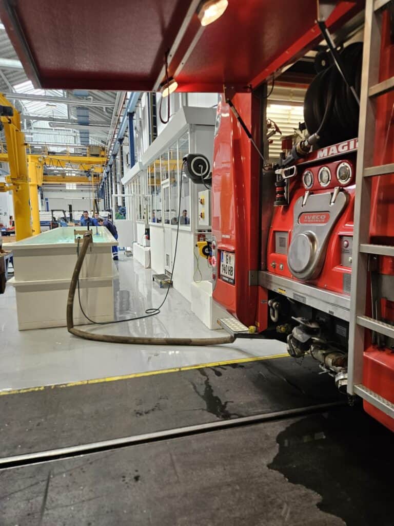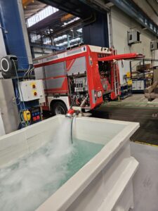 Zur Überprüfung von Unterwassermotoren wurde eigens ein Becken gebaut. Da jedoch keine Möglichkeit bestand, dieses mit Wasser zu füllen und der Kunde bereits vor Ort war, wurden wir gerufen, um das Wasserbecken zu befüllen.